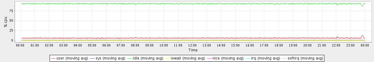 avg(user) = 6.00 avg(sys) = 0.63 avg(idle) = 93.27 avg(iowait) = 0.01 avg(nice) = 0.00 avg(irq) = 0.00 avg(softirq) = 0.08