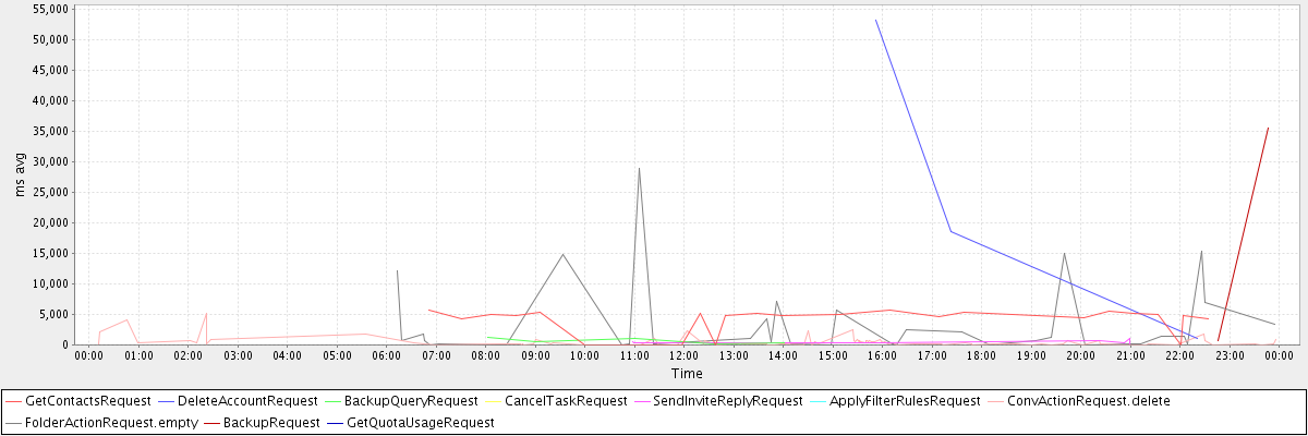 avg(GetContactsRequest) = 2527.93 avg(DeleteAccountRequest) = 24265.00 avg(BackupQueryRequest) = 666.00 avg(CancelTaskRequest) = 558.00 avg(SendInviteReplyRequest) = 470.33 avg(ApplyFilterRulesRequest) = 3629.00 avg(ConvActionRequest.delete) = 452.76 avg(FolderActionRequest.empty) = 3410.84 avg(BackupRequest) = 18110.00 avg(GetQuotaUsageRequest) = 2052.00