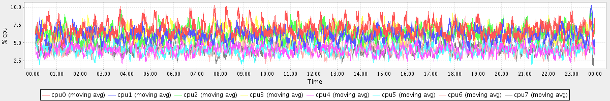 avg(cpu0) = 6.95 avg(cpu1) = 6.10 avg(cpu2) = 6.26 avg(cpu3) = 6.43 avg(cpu4) = 4.09 avg(cpu5) = 4.10 avg(cpu6) = 4.27 avg(cpu7) = 4.31