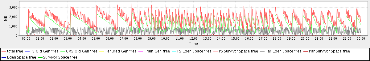 avg(total free) = 1764.99 avg(PS Old Gen free) = 0.00 avg(CMS Old Gen free) = 1250.71 avg(Tenured Gen free) = 0.00 avg(Train Gen free) = 0.00 avg(PS Eden Space free) = 0.00 avg(PS Survivor Space free) = 0.00 avg(Par Eden Space free) = 483.62 avg(Par Survivor Space free) = 30.66 avg(Eden Space free) = 0.00 avg(Survivor Space free) = 0.00