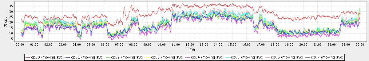 avg(cpu0) = 28.01 avg(cpu1) = 17.00 avg(cpu2) = 17.85 avg(cpu3) = 17.84 avg(cpu4) = 15.18 avg(cpu5) = 18.89 avg(cpu6) = 19.18 avg(cpu7) = 18.10