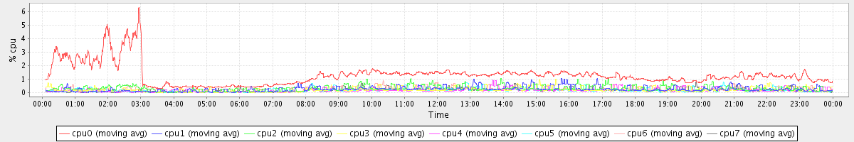 avg(cpu0) = 1.29 avg(cpu1) = 0.25 avg(cpu2) = 0.30 avg(cpu3) = 0.21 avg(cpu4) = 0.17 avg(cpu5) = 0.16 avg(cpu6) = 0.22 avg(cpu7) = 0.16
