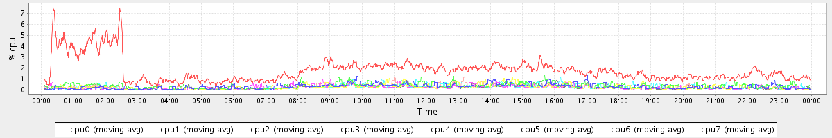 avg(cpu0) = 1.77 avg(cpu1) = 0.32 avg(cpu2) = 0.36 avg(cpu3) = 0.28 avg(cpu4) = 0.23 avg(cpu5) = 0.26 avg(cpu6) = 0.27 avg(cpu7) = 0.21