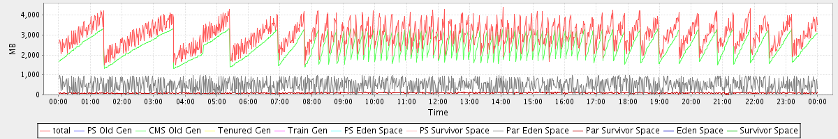 avg(total) = 3000.85 avg(PS Old Gen) = 0.00 avg(CMS Old Gen) = 2416.30 avg(Tenured Gen) = 0.00 avg(Train Gen) = 0.00 avg(PS Eden Space) = 0.00 avg(PS Survivor Space) = 0.00 avg(Par Eden Space) = 492.72 avg(Par Survivor Space) = 91.83 avg(Eden Space) = 0.00 avg(Survivor Space) = 0.00