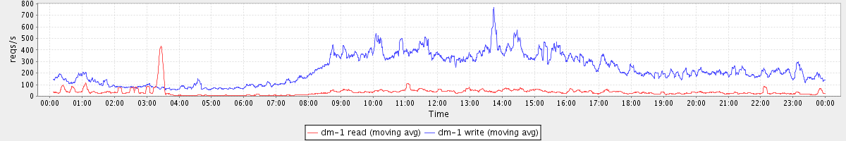 avg(dm-1 read) = 466.29 avg(dm-1 write) = 1281.81