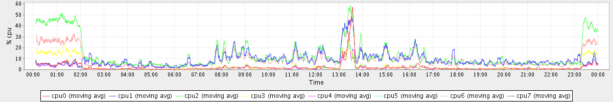 avg(cpu0) = 1.27 avg(cpu1) = 0.27 avg(cpu2) = 0.30 avg(cpu3) = 0.21 avg(cpu4) = 0.15 avg(cpu5) = 0.16 avg(cpu6) = 0.24 avg(cpu7) = 0.17