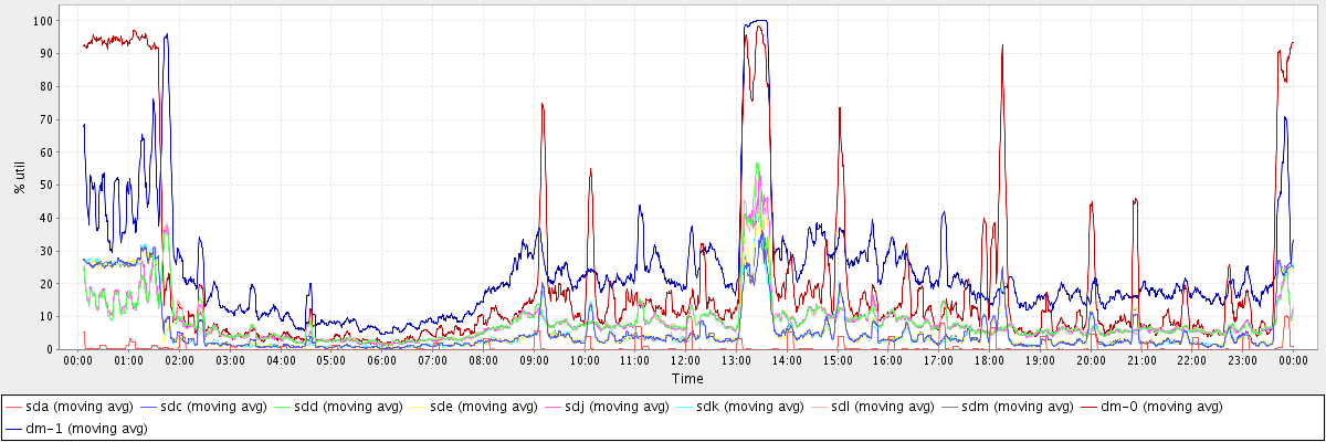 avg(sda) = 0.67 avg(sdc) = 5.84 avg(sdd) = 8.46 avg(sde) = 5.97 avg(sdj) = 8.48 avg(sdk) = 5.84 avg(sdl) = 8.49 avg(sdm) = 5.86 avg(dm-0) = 20.76 avg(dm-1) = 23.94