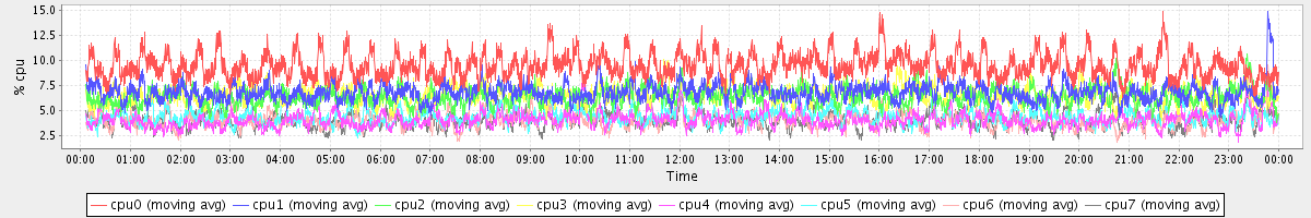 avg(cpu0) = 9.50 avg(cpu1) = 6.85 avg(cpu2) = 6.42 avg(cpu3) = 6.58 avg(cpu4) = 4.06 avg(cpu5) = 4.44 avg(cpu6) = 4.10 avg(cpu7) = 4.04