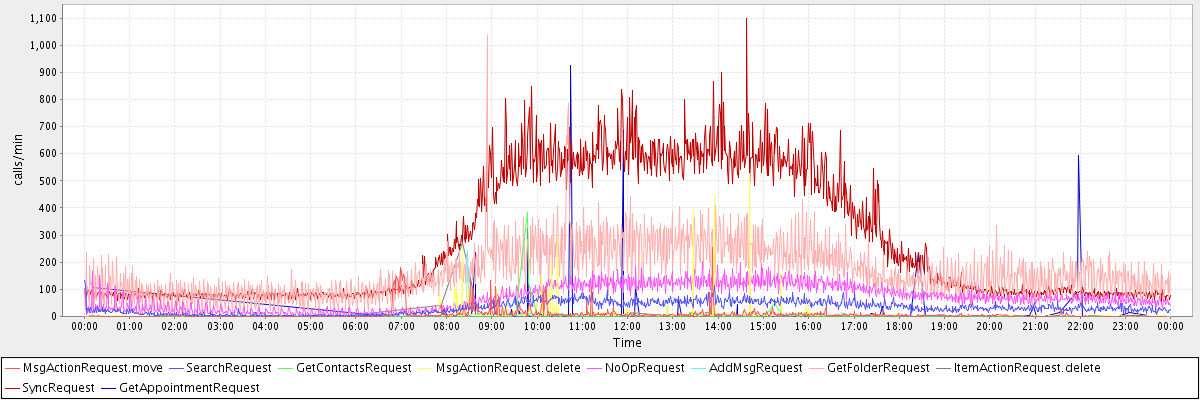 max(MsgActionRequest.move) = 255.00 max(SearchRequest) = 134.00 max(GetContactsRequest) = 384.00 max(MsgActionRequest.delete) = 526.00 max(NoOpRequest) = 201.00 max(AddMsgRequest) = 244.00 max(GetFolderRequest) = 1037.00 max(ItemActionRequest.delete) = 274.00 max(SyncRequest) = 1097.00 max(GetAppointmentRequest) = 924.00