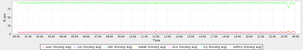avg(user) = 5.73 avg(sys) = 0.56 avg(idle) = 93.49 avg(iowait) = 0.22 avg(nice) = 0.00 avg(irq) = 0.00 avg(softirq) = 0.00