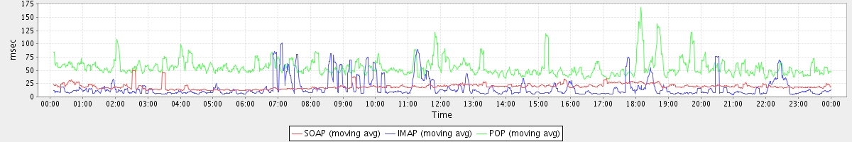 max(SearchConvRequest) = 65.00 max(GetFolderRequest) = 416.00 max(SearchRequest) = 100.00 max(GetContactsRequest) = 436.00 max(MsgActionRequest.delete) = 610.00 max(NoOpRequest) = 72.00 max(SyncRequest) = 356.00 max(GetEffectiveFolderPermsRequest) = 99.00 max(GetAppointmentRequest) = 543.00 max(AddMsgRequest) = 229.00