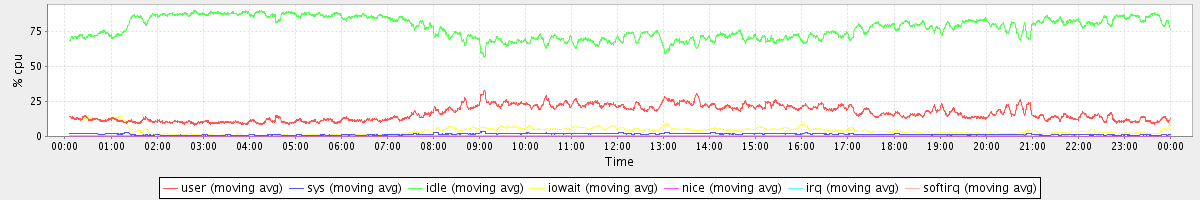 avg(user) = 16.50 avg(sys) = 1.49 avg(idle) = 77.37 avg(iowait) = 4.10 avg(nice) = 0.00 avg(irq) = 0.05 avg(softirq) = 0.50
