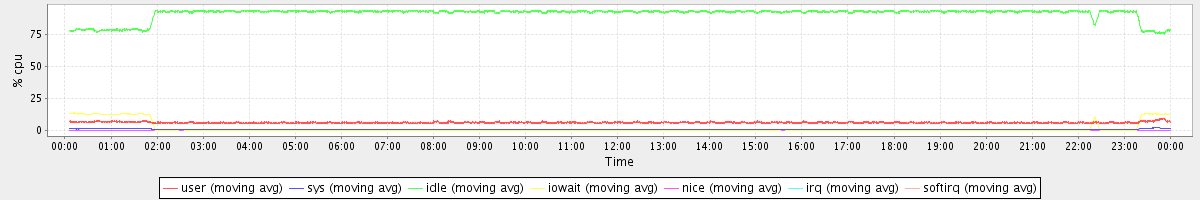 avg(user) = 6.11 avg(sys) = 0.70 avg(idle) = 91.65 avg(iowait) = 1.53 avg(nice) = 0.00 avg(irq) = 0.00 avg(softirq) = 0.02