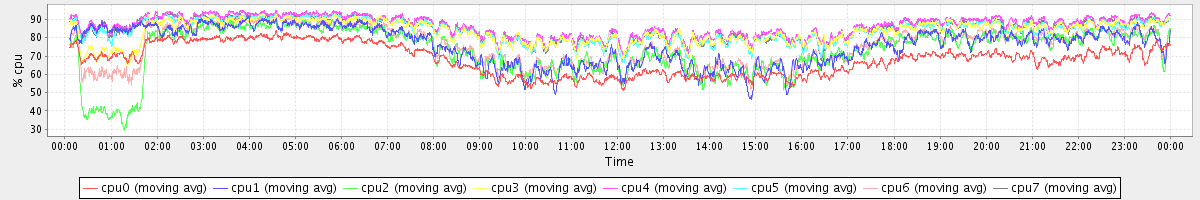 avg(cpu0) = 68.13 avg(cpu1) = 75.95 avg(cpu2) = 72.86 avg(cpu3) = 83.41 avg(cpu4) = 86.52 avg(cpu5) = 84.17 avg(cpu6) = 75.88 avg(cpu7) = 84.90