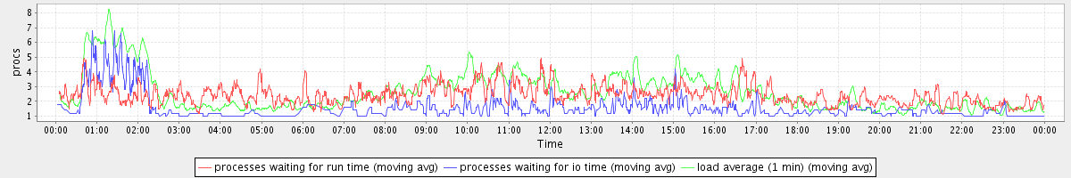 avg(processes waiting for run time) = 1.86 avg(processes waiting for io time) = 0.78 avg(load average (1 min)) = 2.65
