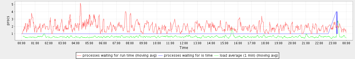 avg(processes waiting for run time) = 0.75 avg(processes waiting for io time) = 0.02 avg(load average (1 min)) = 0.61