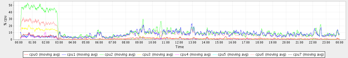 avg(cpu0) = 1.35 avg(cpu1) = 0.25 avg(cpu2) = 0.28 avg(cpu3) = 0.19 avg(cpu4) = 0.14 avg(cpu5) = 0.14 avg(cpu6) = 0.21 avg(cpu7) = 0.13