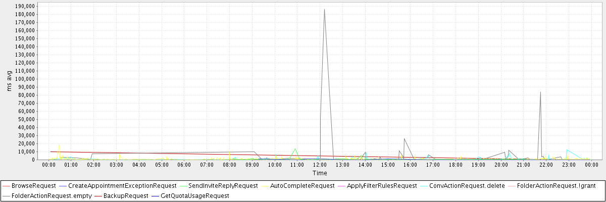 avg(BrowseRequest) = 1171.00 avg(CreateAppointmentExceptionRequest) = 556.10 avg(SendInviteReplyRequest) = 823.48 avg(AutoCompleteRequest) = 764.01 avg(ApplyFilterRulesRequest) = 58876.00 avg(ConvActionRequest.delete) = 851.61 avg(FolderActionRequest.!grant) = 595.00 avg(FolderActionRequest.empty) = 6460.44 avg(BackupRequest) = 5103.00 avg(GetQuotaUsageRequest) = 2088.00