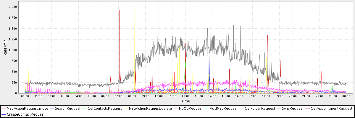 max(MsgActionRequest.move) = 527.00 max(SearchRequest) = 175.00 max(GetContactsRequest) = 738.00 max(MsgActionRequest.delete) = 2033.00 max(NoOpRequest) = 320.00 max(AddMsgRequest) = 155.00 max(GetFolderRequest) = 184.00 max(SyncRequest) = 1575.00 max(GetAppointmentRequest) = 1920.00 max(CreateContactRequest) = 936.00