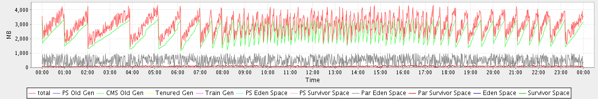 avg(total) = 2944.94 avg(PS Old Gen) = 0.00 avg(CMS Old Gen) = 2368.74 avg(Tenured Gen) = 0.00 avg(Train Gen) = 0.00 avg(PS Eden Space) = 0.00 avg(PS Survivor Space) = 0.00 avg(Par Eden Space) = 490.75 avg(Par Survivor Space) = 85.45 avg(Eden Space) = 0.00 avg(Survivor Space) = 0.00