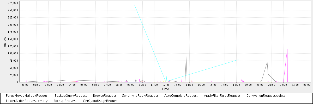 avg(PurgeMovedMailboxRequest) = 72352.00 avg(BackupQueryRequest) = 573.20 avg(BrowseRequest) = 1769.00 avg(SendInviteReplyRequest) = 675.81 avg(AutoCompleteRequest) = 848.20 avg(ApplyFilterRulesRequest) = 74661.00 avg(ConvActionRequest.delete) = 660.05 avg(FolderActionRequest.empty) = 5337.14 avg(BackupRequest) = 6812.00 avg(GetQuotaUsageRequest) = 1279.00