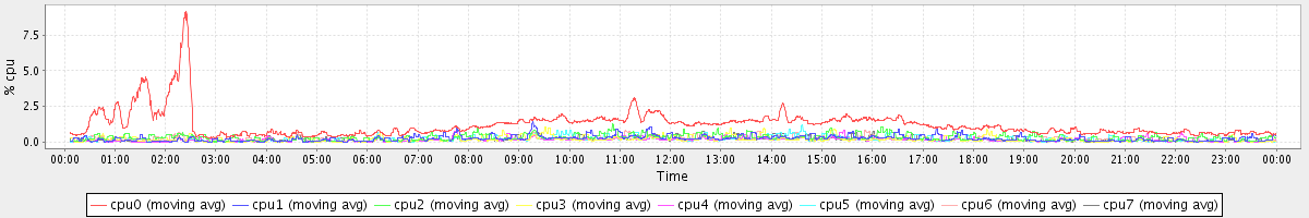 avg(cpu0) = 1.22 avg(cpu1) = 0.25 avg(cpu2) = 0.31 avg(cpu3) = 0.19 avg(cpu4) = 0.15 avg(cpu5) = 0.19 avg(cpu6) = 0.21 avg(cpu7) = 0.17