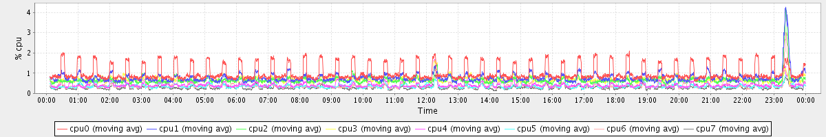 avg(cpu0) = 1.02 avg(cpu1) = 0.78 avg(cpu2) = 0.67 avg(cpu3) = 0.69 avg(cpu4) = 0.42 avg(cpu5) = 0.36 avg(cpu6) = 0.39 avg(cpu7) = 0.31