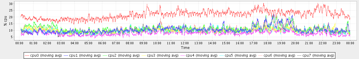 avg(cpu0) = 1.22 avg(cpu1) = 0.19 avg(cpu2) = 0.23 avg(cpu3) = 0.15 avg(cpu4) = 0.12 avg(cpu5) = 0.13 avg(cpu6) = 0.17 avg(cpu7) = 0.12