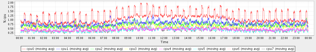 avg(cpu0) = 1.13 avg(cpu1) = 0.80 avg(cpu2) = 0.72 avg(cpu3) = 0.64 avg(cpu4) = 0.45 avg(cpu5) = 0.41 avg(cpu6) = 0.44 avg(cpu7) = 0.43