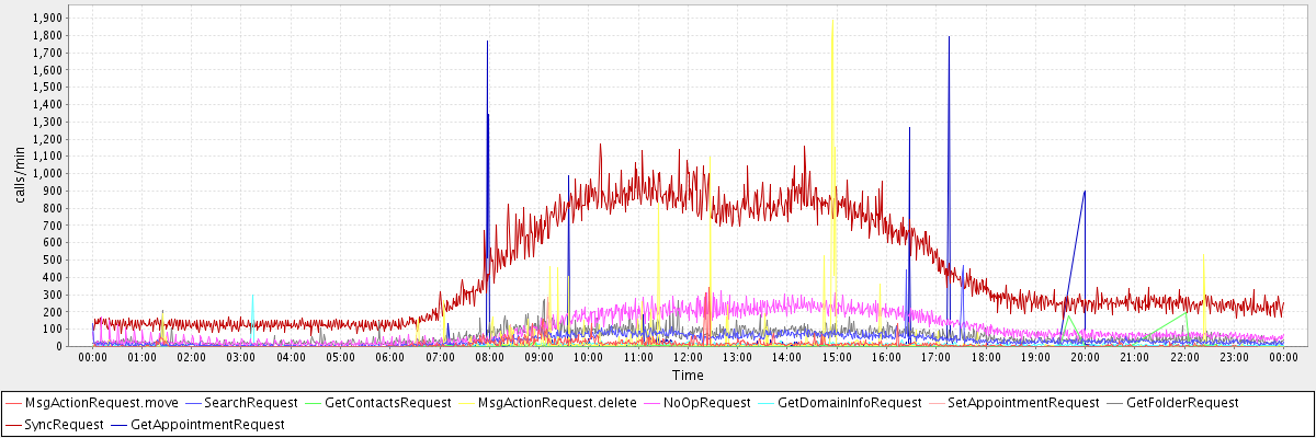 max(MsgActionRequest.move) = 345.00 max(SearchRequest) = 469.00 max(GetContactsRequest) = 194.00 max(MsgActionRequest.delete) = 1885.00 max(NoOpRequest) = 323.00 max(GetDomainInfoRequest) = 299.00 max(SetAppointmentRequest) = 284.00 max(GetFolderRequest) = 272.00 max(SyncRequest) = 1173.00 max(GetAppointmentRequest) = 1791.00