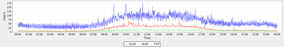 Host zm08.stanford.edu: Mailboxd: Request Rate by Client Protocol