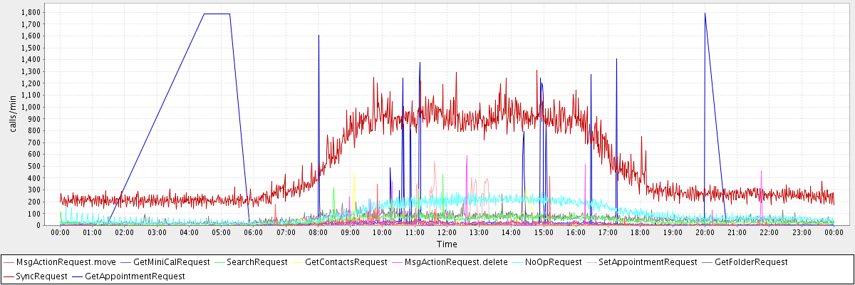 max(MsgActionRequest.move) = 415.00 max(GetMiniCalRequest) = 140.00 max(SearchRequest) = 431.00 max(GetContactsRequest) = 440.00 max(MsgActionRequest.delete) = 588.00 max(NoOpRequest) = 284.00 max(SetAppointmentRequest) = 544.00 max(GetFolderRequest) = 265.00 max(SyncRequest) = 1311.00 max(GetAppointmentRequest) = 1790.00