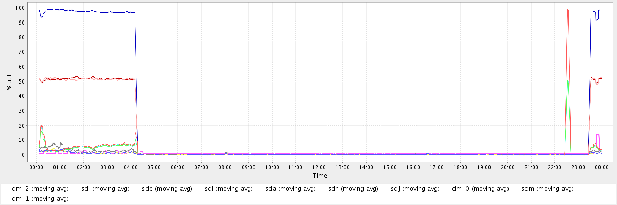 avg(dm-2) = 1.92 avg(sdl) = 0.51 avg(sde) = 1.42 avg(sdi) = 0.49 avg(sda) = 1.16 avg(sdh) = 1.44 avg(sdj) = 10.19 avg(dm-0) = 0.98 avg(sdm) = 10.23 avg(dm-1) = 19.31