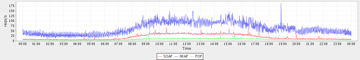 Host zm08.stanford.edu: Mailboxd: Request Rate by Client Protocol