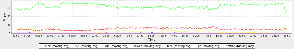 avg(user) = 12.91 avg(sys) = 1.32 avg(idle) = 80.48 avg(iowait) = 4.93 avg(nice) = 0.00 avg(irq) = 0.02 avg(softirq) = 0.34