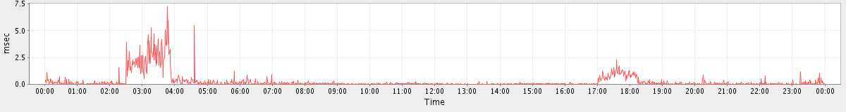 avg(CheckRecurConflictsRequest) = 1238.27 avg(FolderActionRequest.delete) = 3857.50 avg(SendInviteReplyRequest) = 878.57 avg(AutoCompleteRequest) = 573.08 avg(ItemActionRequest.delete) = 792.44 avg(ApplyFilterRulesRequest) = 99955.00 avg(ConvActionRequest.delete) = 1029.57 avg(FolderActionRequest.empty) = 3648.37 avg(BackupRequest) = 3679.50 avg(GetQuotaUsageRequest) = 1297.00