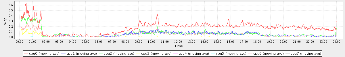 avg(cpu0) = 0.18 avg(cpu1) = 0.05 avg(cpu2) = 0.07 avg(cpu3) = 0.01 avg(cpu4) = 0.00 avg(cpu5) = 0.00 avg(cpu6) = 0.05 avg(cpu7) = 0.00