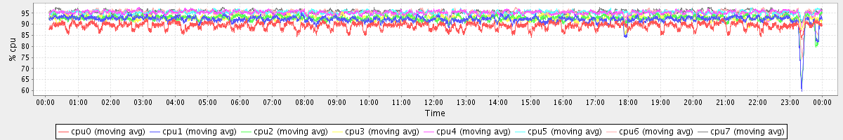 avg(cpu0) = 89.37 avg(cpu1) = 92.13 avg(cpu2) = 92.65 avg(cpu3) = 92.69 avg(cpu4) = 95.20 avg(cpu5) = 95.20 avg(cpu6) = 95.28 avg(cpu7) = 95.59