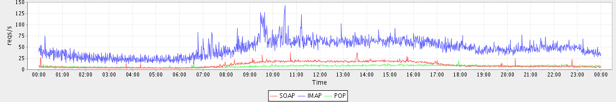 Host zm02.stanford.edu: Mailboxd: Request Rate by Client Protocol