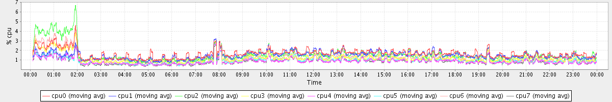 avg(cpu0) = 1.44 avg(cpu1) = 0.25 avg(cpu2) = 0.31 avg(cpu3) = 0.20 avg(cpu4) = 0.14 avg(cpu5) = 0.16 avg(cpu6) = 0.23 avg(cpu7) = 0.15