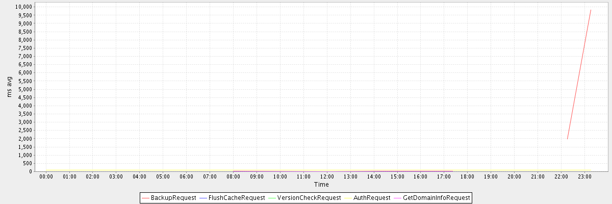 avg(BackupRequest) = 5901.50 avg(FlushCacheRequest) = 48.00 avg(VersionCheckRequest) = 1816.00 avg(AuthRequest) = 90.00 avg(GetDomainInfoRequest) = 13.30