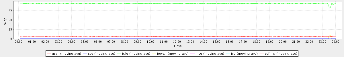 avg(user) = 5.73 avg(sys) = 0.58 avg(idle) = 93.59 avg(iowait) = 0.09 avg(nice) = 0.00 avg(irq) = 0.00 avg(softirq) = 0.00