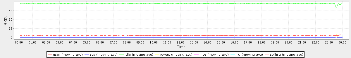 avg(user) = 5.74 avg(sys) = 0.58 avg(idle) = 93.58 avg(iowait) = 0.08 avg(nice) = 0.00 avg(irq) = 0.00 avg(softirq) = 0.00