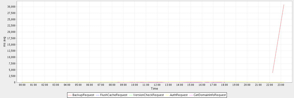avg(BackupRequest) = 17302.00 avg(FlushCacheRequest) = 49.00 avg(VersionCheckRequest) = 714.00 avg(AuthRequest) = 173.25 avg(GetDomainInfoRequest) = 8.72