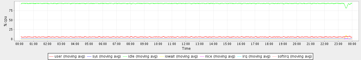 avg(user) = 5.63 avg(sys) = 0.57 avg(idle) = 93.69 avg(iowait) = 0.09 avg(nice) = 0.00 avg(irq) = 0.00 avg(softirq) = 0.00