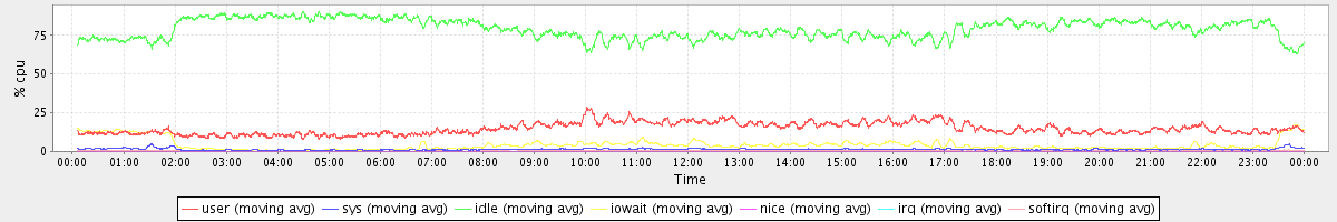 avg(user) = 14.76 avg(sys) = 1.36 avg(idle) = 79.23 avg(iowait) = 4.22 avg(nice) = 0.00 avg(irq) = 0.02 avg(softirq) = 0.40