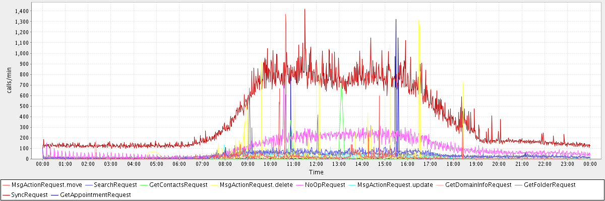 max(MsgActionRequest.move) = 1369.00 max(SearchRequest) = 296.00 max(GetContactsRequest) = 729.00 max(MsgActionRequest.delete) = 1309.00 max(NoOpRequest) = 705.00 max(MsgActionRequest.update) = 135.00 max(GetDomainInfoRequest) = 169.00 max(GetFolderRequest) = 668.00 max(SyncRequest) = 1414.00 max(GetAppointmentRequest) = 1322.00