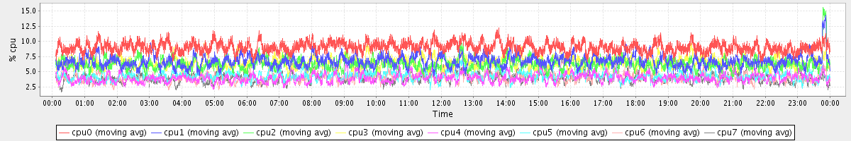 avg(cpu0) = 9.04 avg(cpu1) = 6.75 avg(cpu2) = 6.33 avg(cpu3) = 6.54 avg(cpu4) = 3.96 avg(cpu5) = 4.38 avg(cpu6) = 4.13 avg(cpu7) = 4.00