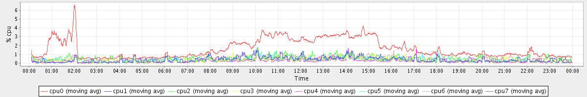 avg(cpu0) = 0.22 avg(cpu1) = 0.05 avg(cpu2) = 0.06 avg(cpu3) = 0.01 avg(cpu4) = 0.00 avg(cpu5) = 0.00 avg(cpu6) = 0.05 avg(cpu7) = 0.00