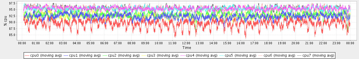 avg(cpu0) = 89.45 avg(cpu1) = 92.29 avg(cpu2) = 92.85 avg(cpu3) = 92.62 avg(cpu4) = 95.44 avg(cpu5) = 95.27 avg(cpu6) = 95.41 avg(cpu7) = 95.56